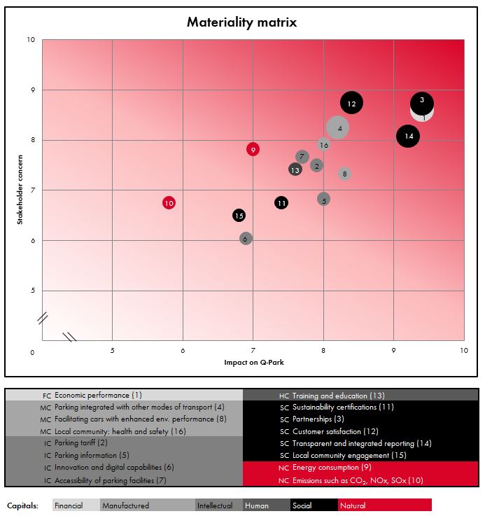 In 2014, we conducted a comprehensive materiality analysis, entirely in accordance with the G4 guidelines. Sixteen aspects emerged from the analysis (see materiality matrix) as the most relevant and impactful for Q-Park.