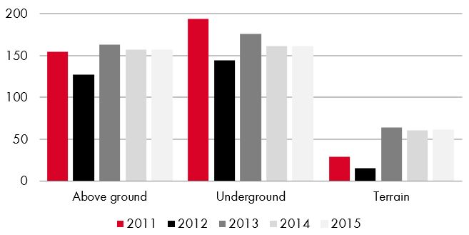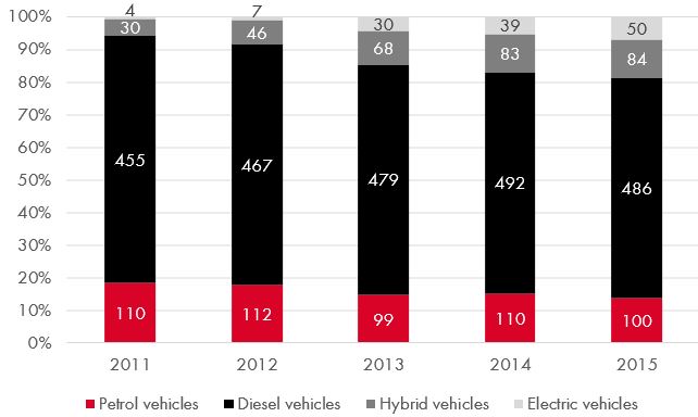 The number of electric cars in the fleet rose to 50 (in 2014 we had 39), and in parking facilities in Germany and Sweden we deployed more electrically driven cleaning machines.